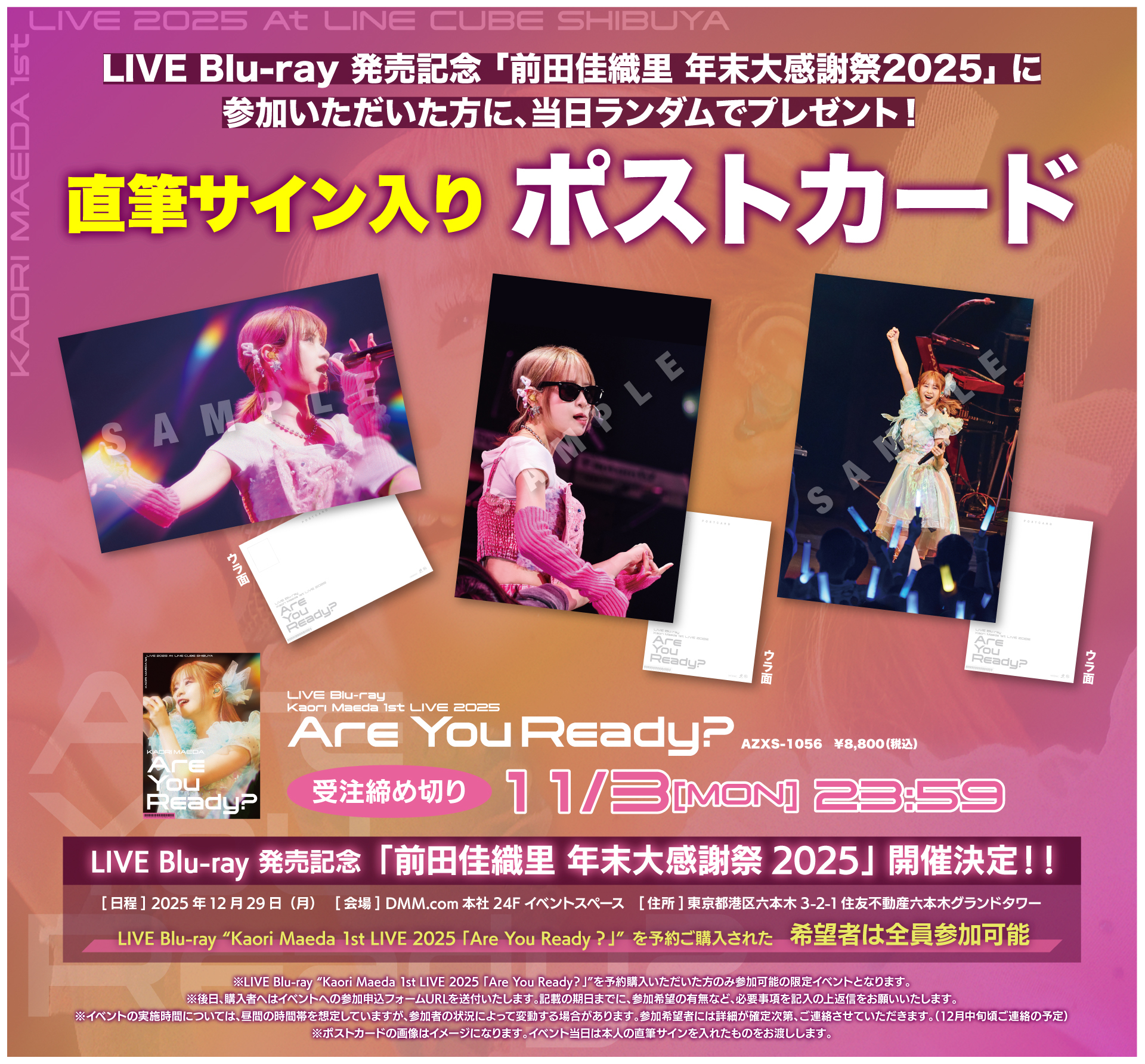 今回の映像作品、LIVE Blu-ray “Kaori Maeda 1st LIVE 2025 「Are You Ready?」”は、アーティストオンラインショップA!SMART(アスマート)での受注販売となり、受付の締め切りは、2025年11月3日(月・祝)23:59となっている。